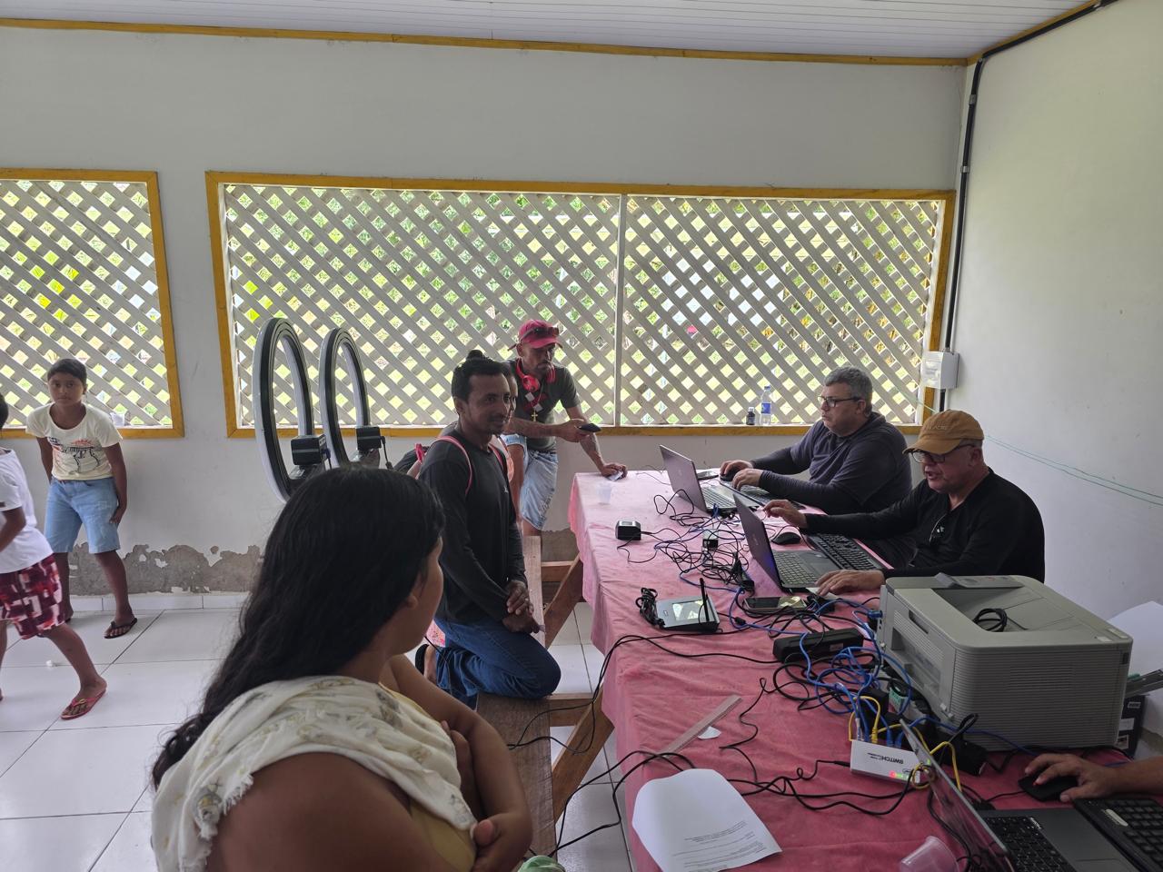 No município de Mâncio Lima, a equipe da Justiça Eleitoral percorreu comunidades ribeirinhas e territórios indígenas, levando serviços essenciais como alistamento eleitoral, revisão cadastral, transferência de domicílio e coleta biométrica.