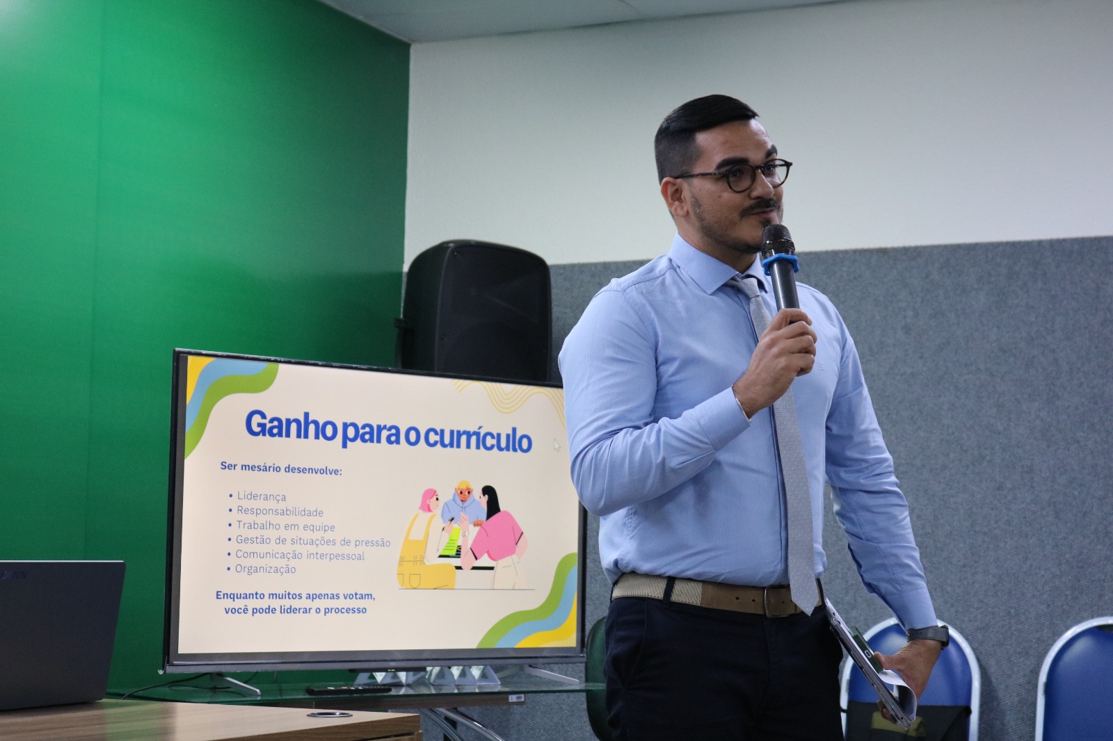 Durante o encontro, Ana Cátia apresentou o Programa Mesário Voluntário, destacando a importância da participação cidadã no fortalecimento do processo eleitoral e na garantia da lisura das eleições. Ela ressaltou que atuar como mesário é uma experiência prática de vivência democrática, que aproxima o cidadão do funcionamento do sistema eleitoral e amplia a compreensão sobre a organização e a segurança do pleito.